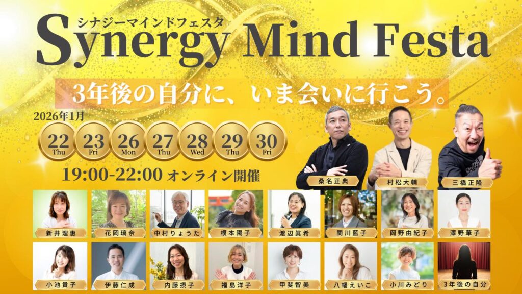 こんにちは、中村りょうたです。 いよいよ1月22日(木)、オンライン大イベント「シナジーマインドフェスタ」が開催されます。 今回のテーマは、「3年後の自分に、いま会いに行こう。」 続きをみる -
